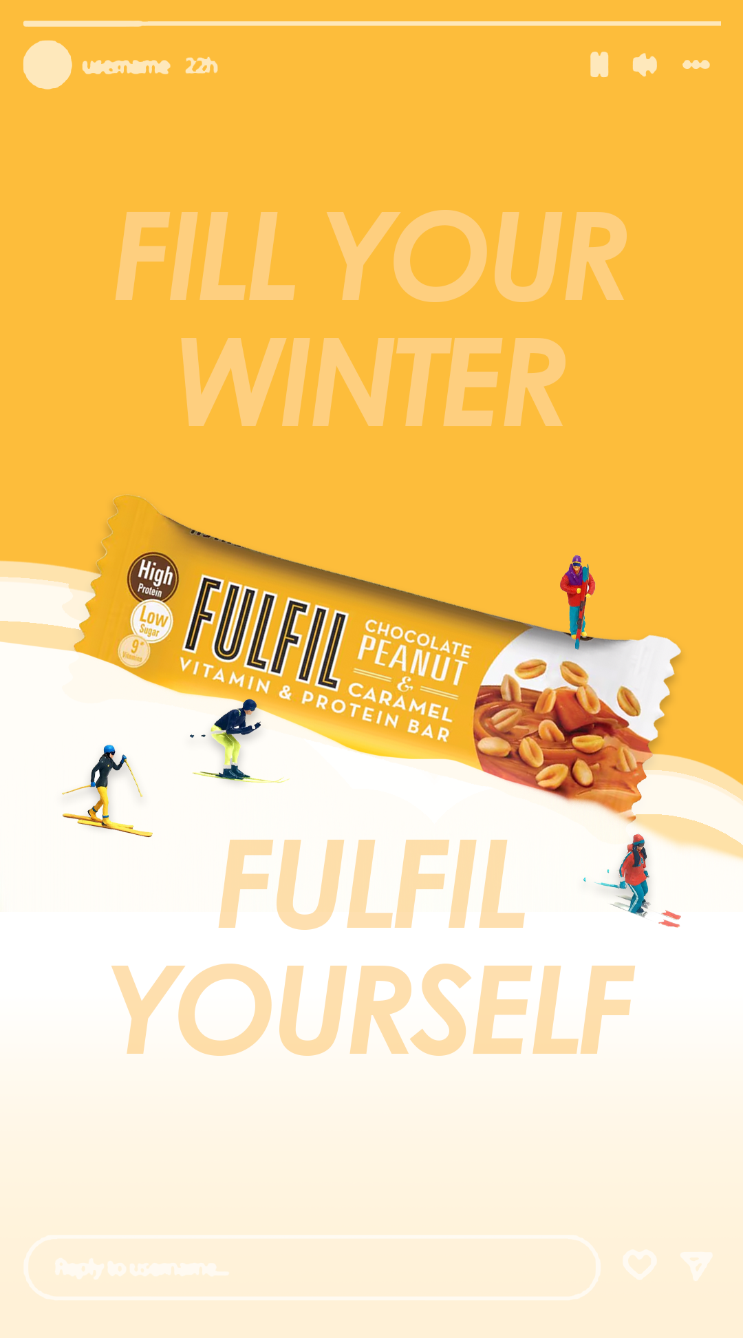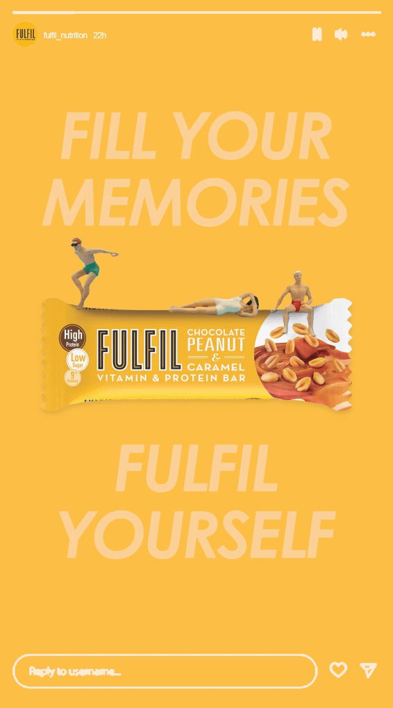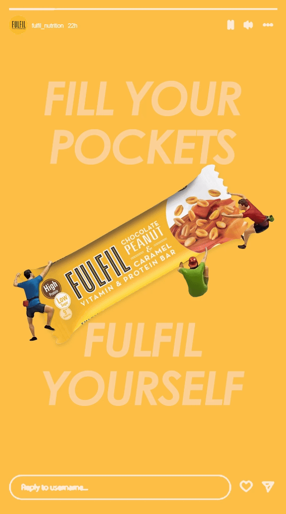 Social media designs for Instagram stories and posts for FULFIL's Vitamin & Protein bar. The flagship FMCG product for the brand, encouraging further social engagement.